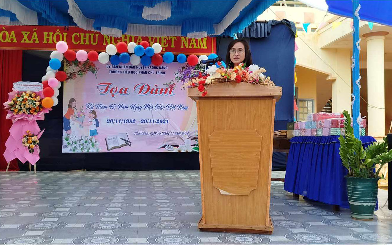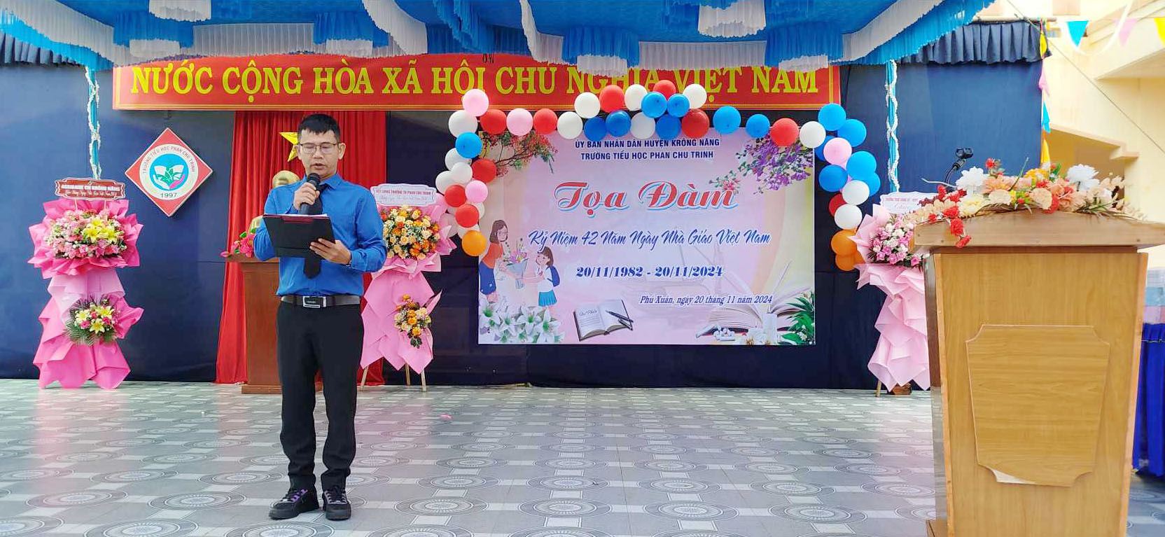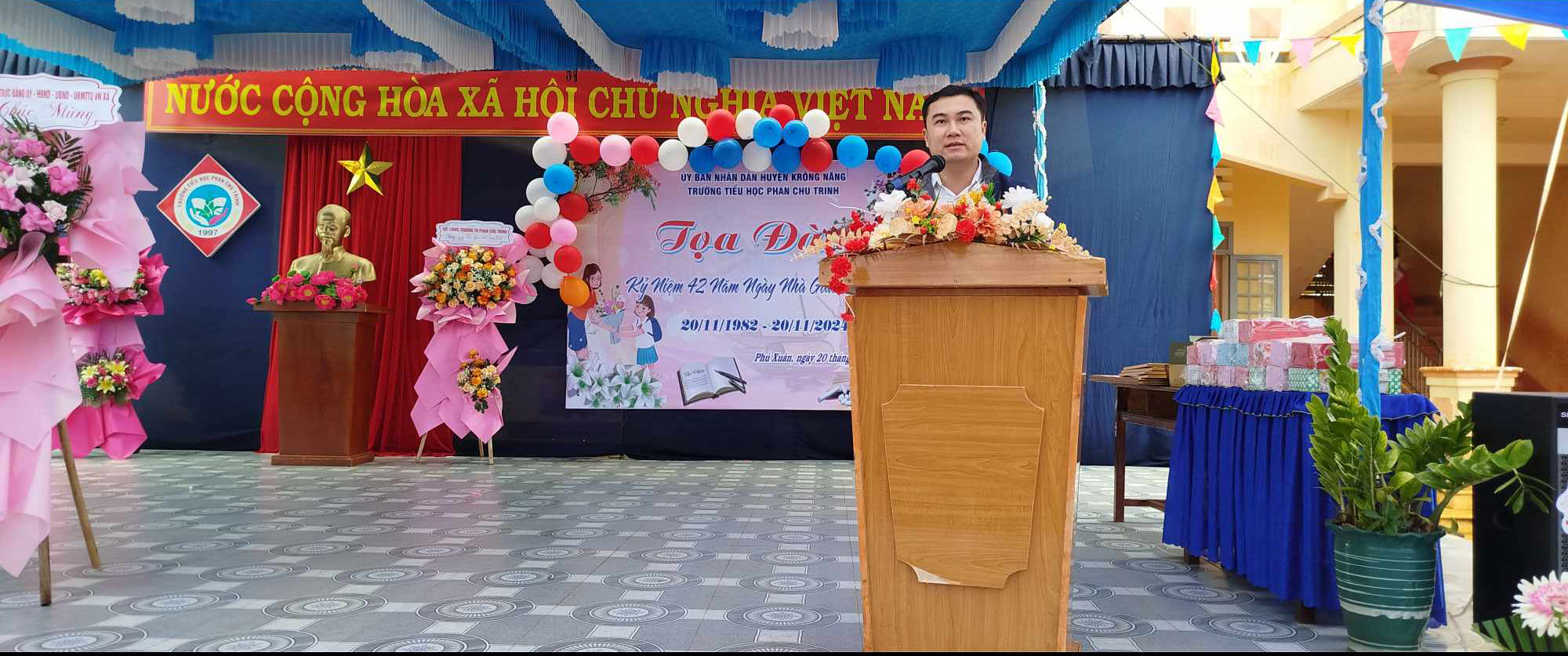 Toàn trường cũng vinh dự được nghe Đồng chí Trần Sơn Tùng – chủ tịch xã Phú Xuân phát biểu, nhấn mạnh tầm quan trọng của nghề giáo, sự tận tâm và lòng kiên nhẫn của các thầy cô trong việc xây dựng thế hệ tương lai của đất nước. Đại biểu cũng bày tỏ sự tri ân sâu sắc đối với những đóng góp của các thầy cô giáo, đồng thời mong muốn trường tiểu học Phan Chu Trinh ngày càng phát triển, đạt được nhiều thành tích nổi bật hơn nữa.