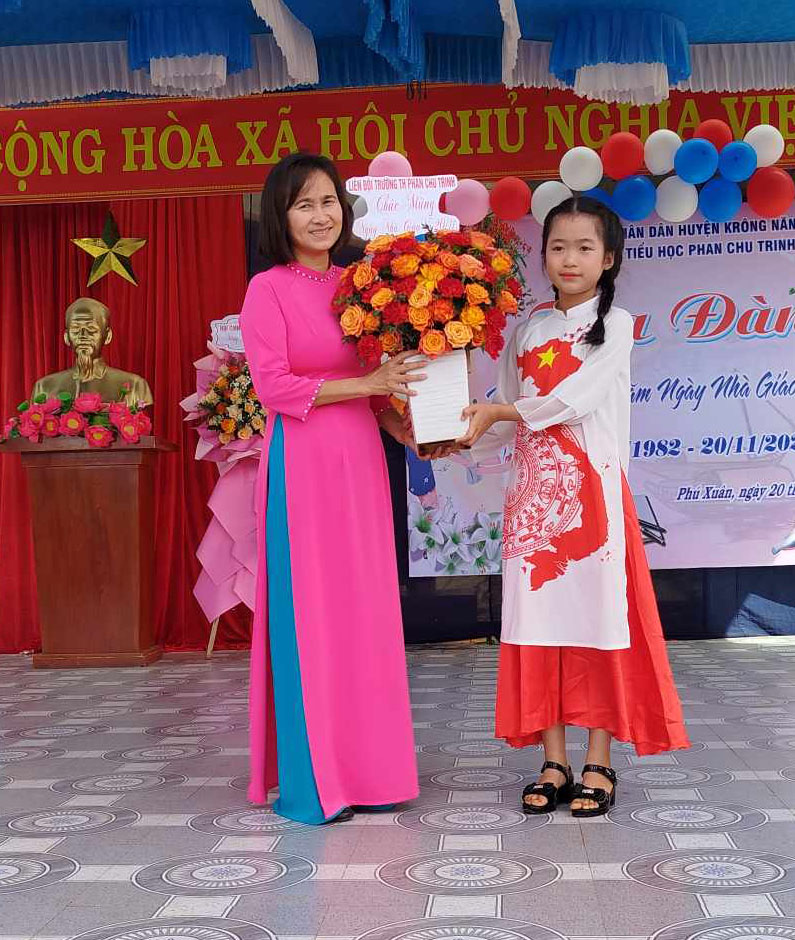 Cuối buổi lễ, bạn Tú Anh lớp 5B đại diện cho các bạn học sinh lên gởi lời tri ân đến quý thầy cô giáo. Giọng đọc của bạn run run nhưng nghe sao mà giàu tình cảm thế: Ngày 20/11 là dịp để chúng em bày tỏ lòng biết ơn sâu sắc tới thầy cô – những người đã dạy dỗ, chăm sóc và dìu dắt chúng em trên con đường học vấn. Thầy cô không chỉ truyền đạt cho chúng em kiến thức mà còn dạy chúng em cách sống, cách làm người. Những bài học của thầy cô không chỉ là những con chữ, mà còn là những giá trị nhân văn, những ước mơ, hy vọng mà thầy cô đã gieo vào trái tim chúng em. Nhân ngày Nhà giáo Việt Nam, chúng em xin gửi tới thầy cô lời cảm ơn chân thành nhất và chúc thầy cô luôn mạnh khỏe, hạnh phúc để tiếp tục là những người lái đò vững vàng, dẫn dắt chúng em đến những bến bờ tri thức.